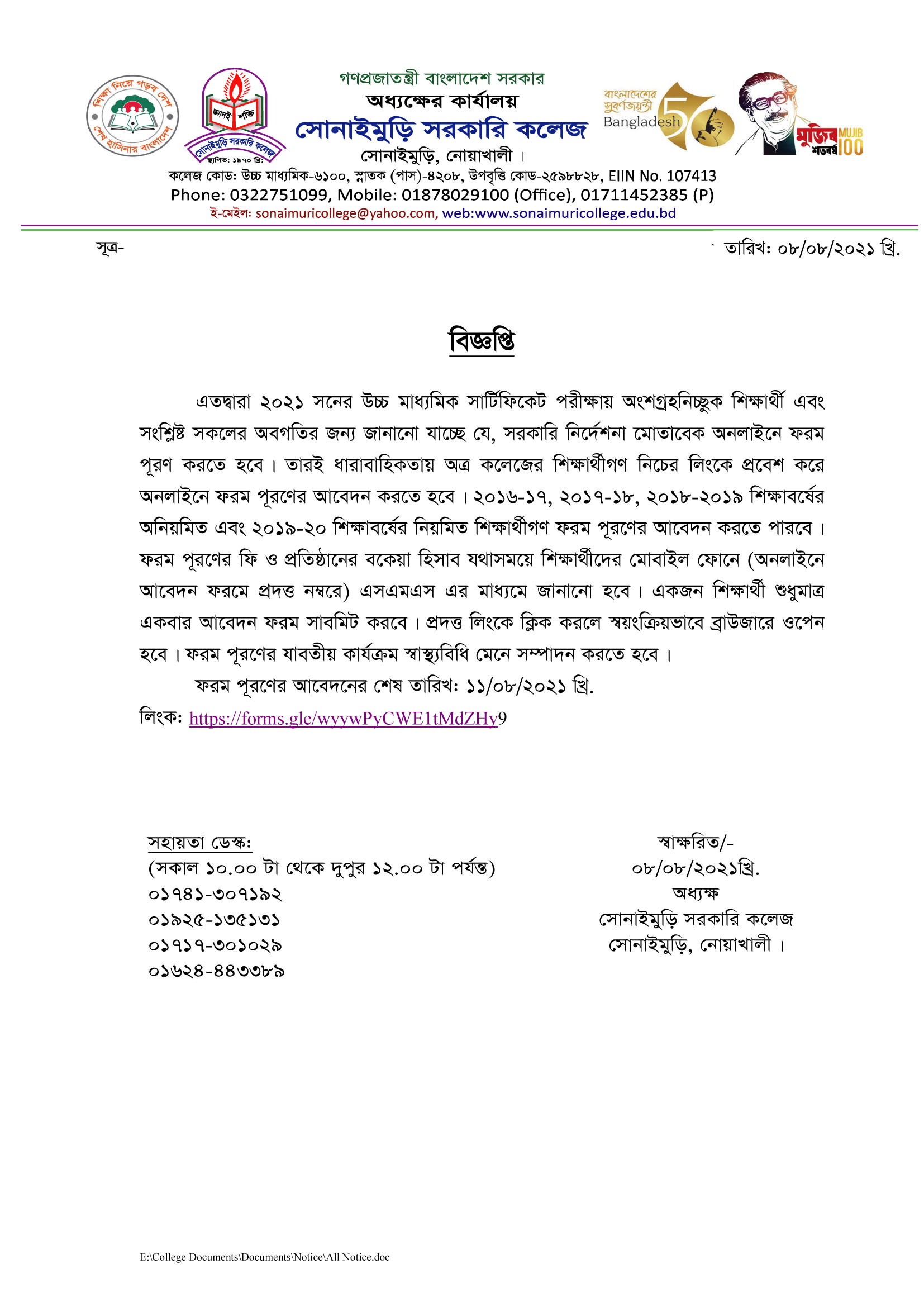 ????????? ?????? ???? ?????: ?????????, ??????: ?????????,????????, ????????? School Code : 6100 Email : sonaimurigovcollege@gmail.com Contact Number: 8801711452385