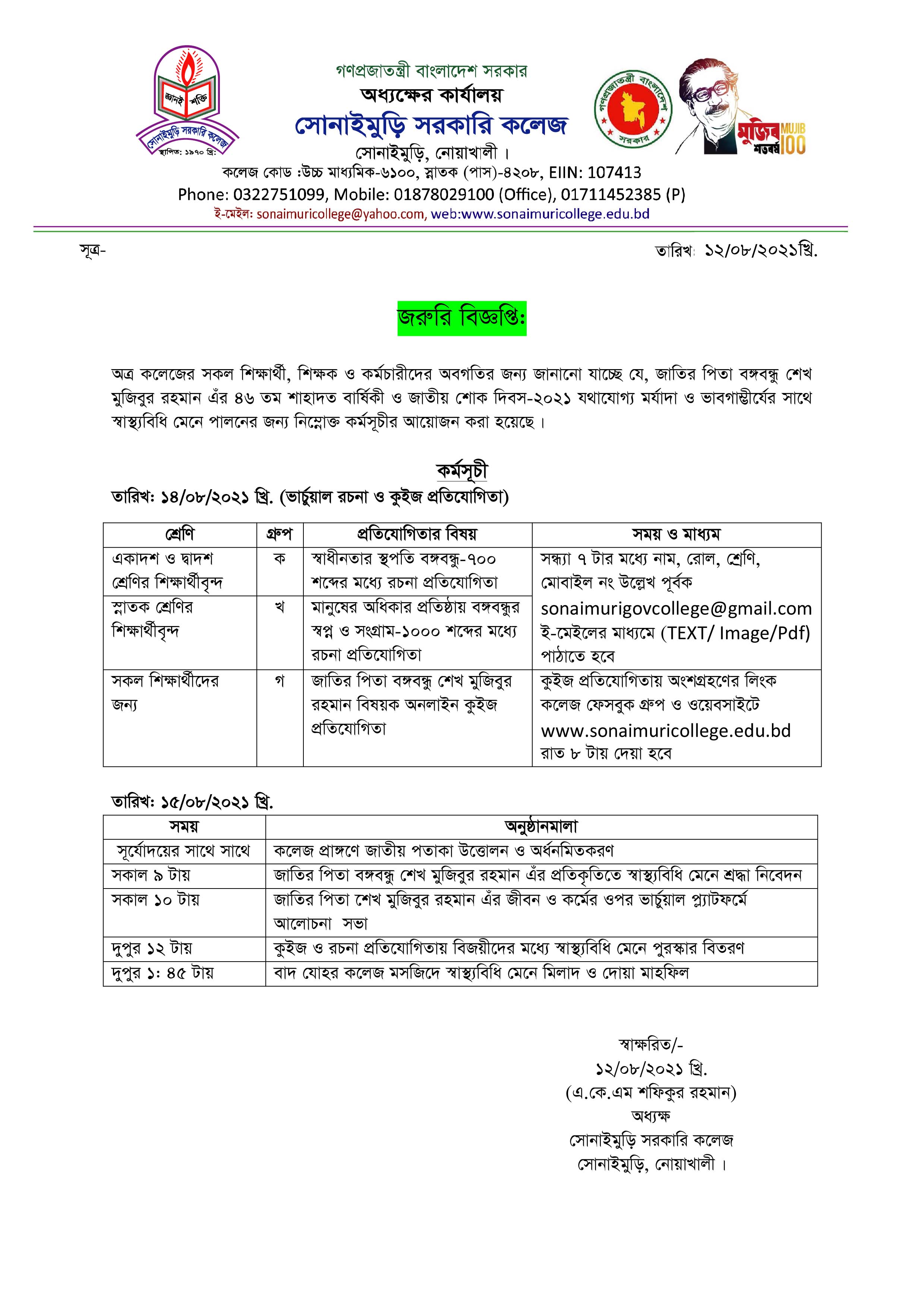 ????????? ?????? ???? ?????: ?????????, ??????: ?????????,????????, ????????? School Code : 6100 Email : sonaimurigovcollege@gmail.com Contact Number: 8801711452385