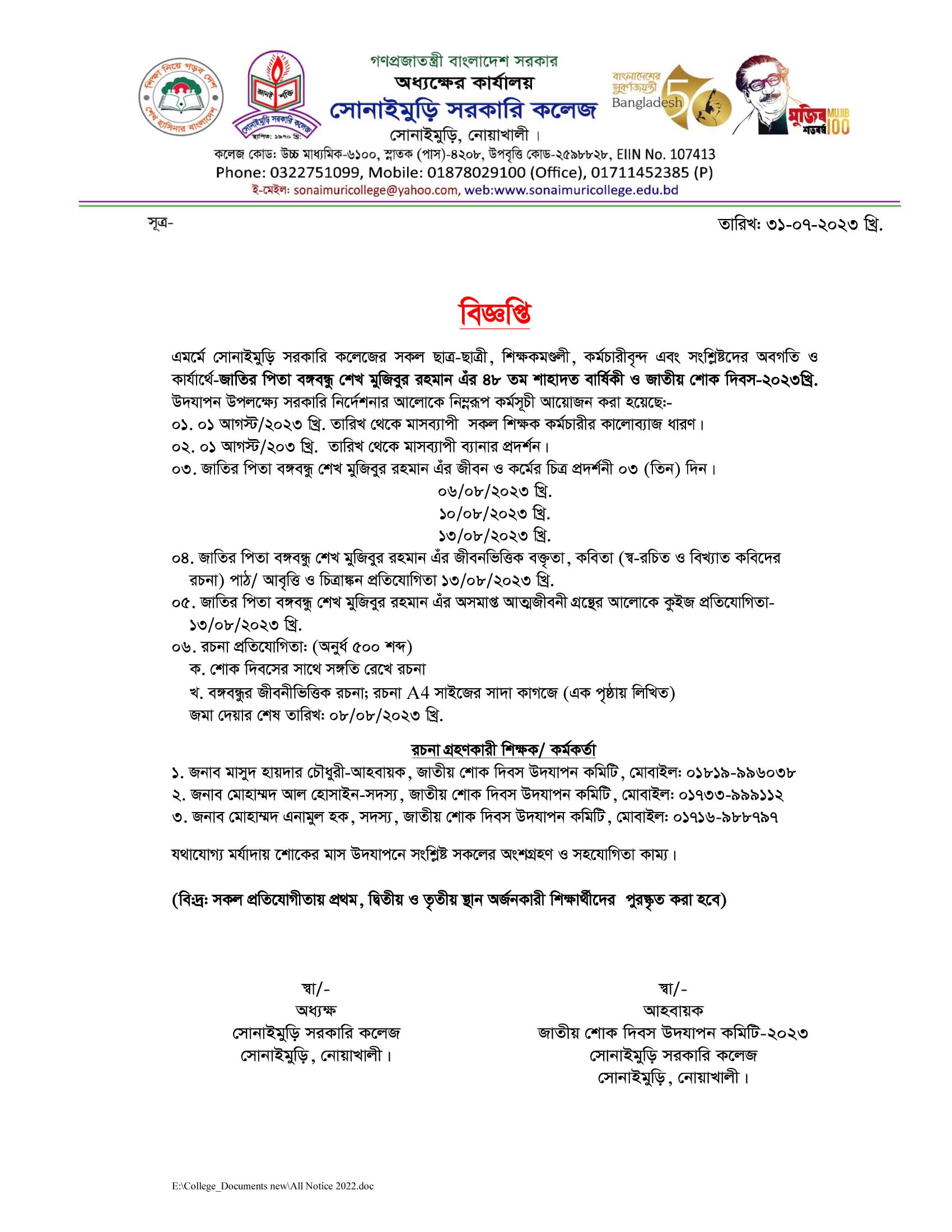 ????????? ?????? ???? ?????: ?????????, ??????: ?????????,????????, ????????? School Code : 6100 Email : sonaimurigovcollege@gmail.com Contact Number: 8801711452385