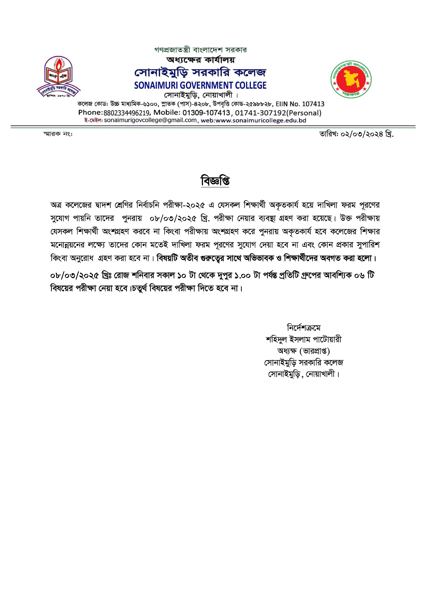 ????????? ?????? ???? ?????: ?????????, ??????: ?????????,????????, ????????? School Code : 6100 Email : sonaimurigovcollege@gmail.com Contact Number: 8801711452385