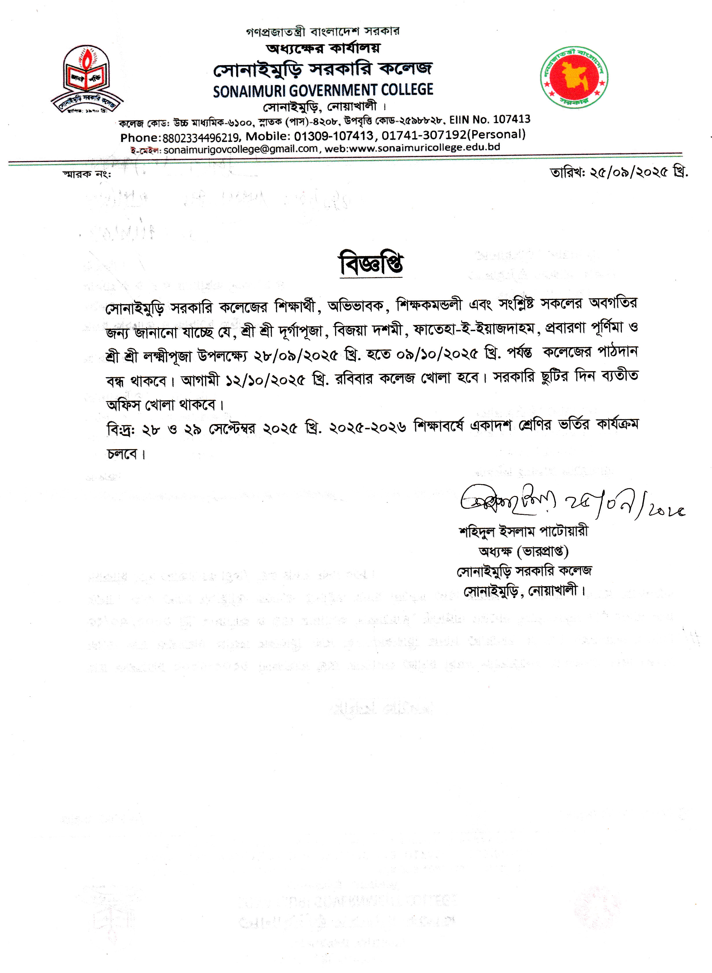 ????????? ?????? ???? ?????: ?????????, ??????: ?????????,????????, ????????? School Code : 6100 Email : sonaimurigovcollege@gmail.com Contact Number: 8801711452385