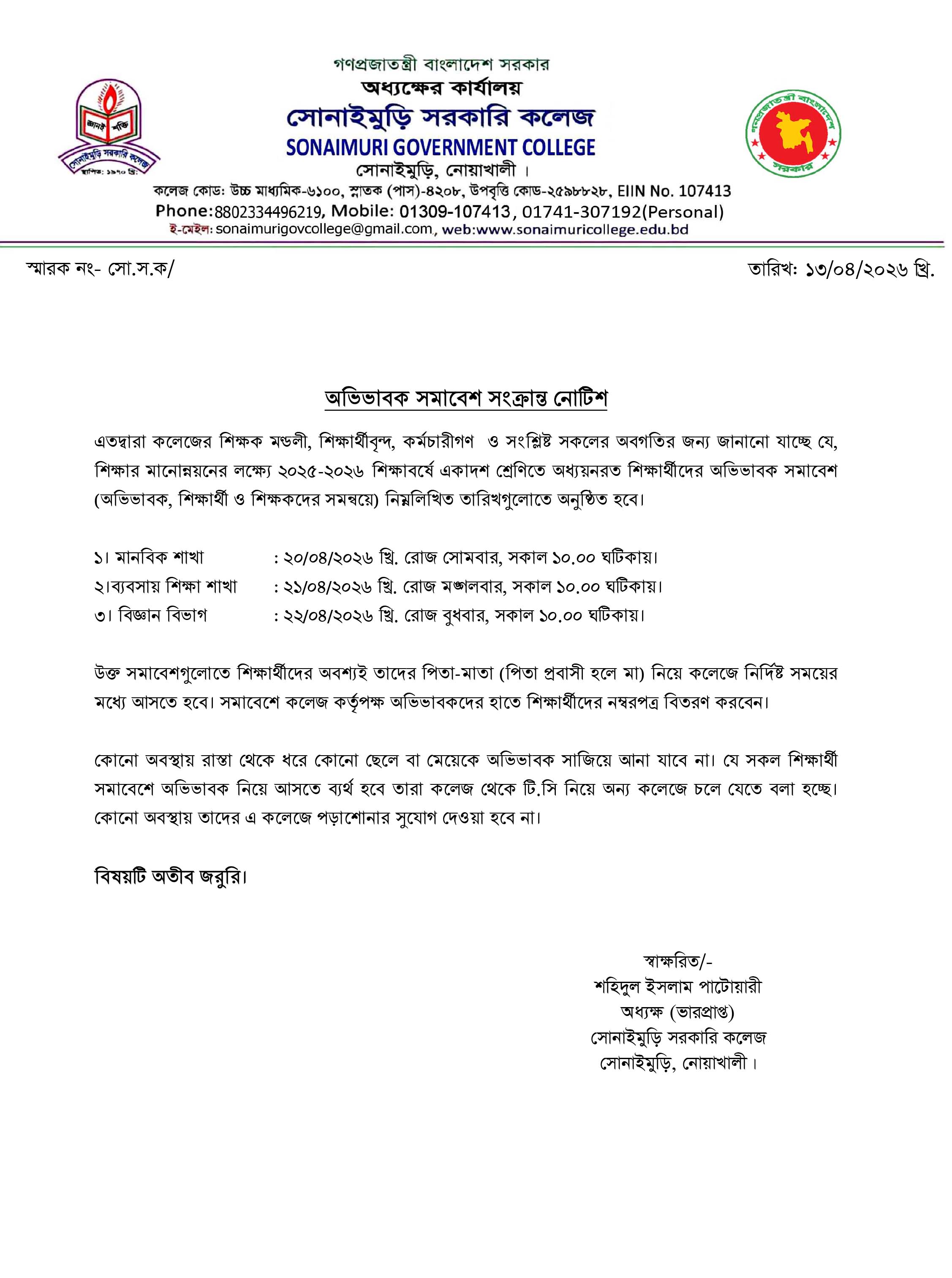 অভিভাবক সমাবেশ সংক্রান্ত জরুরি বিজ্ঞপ্তি (Download)