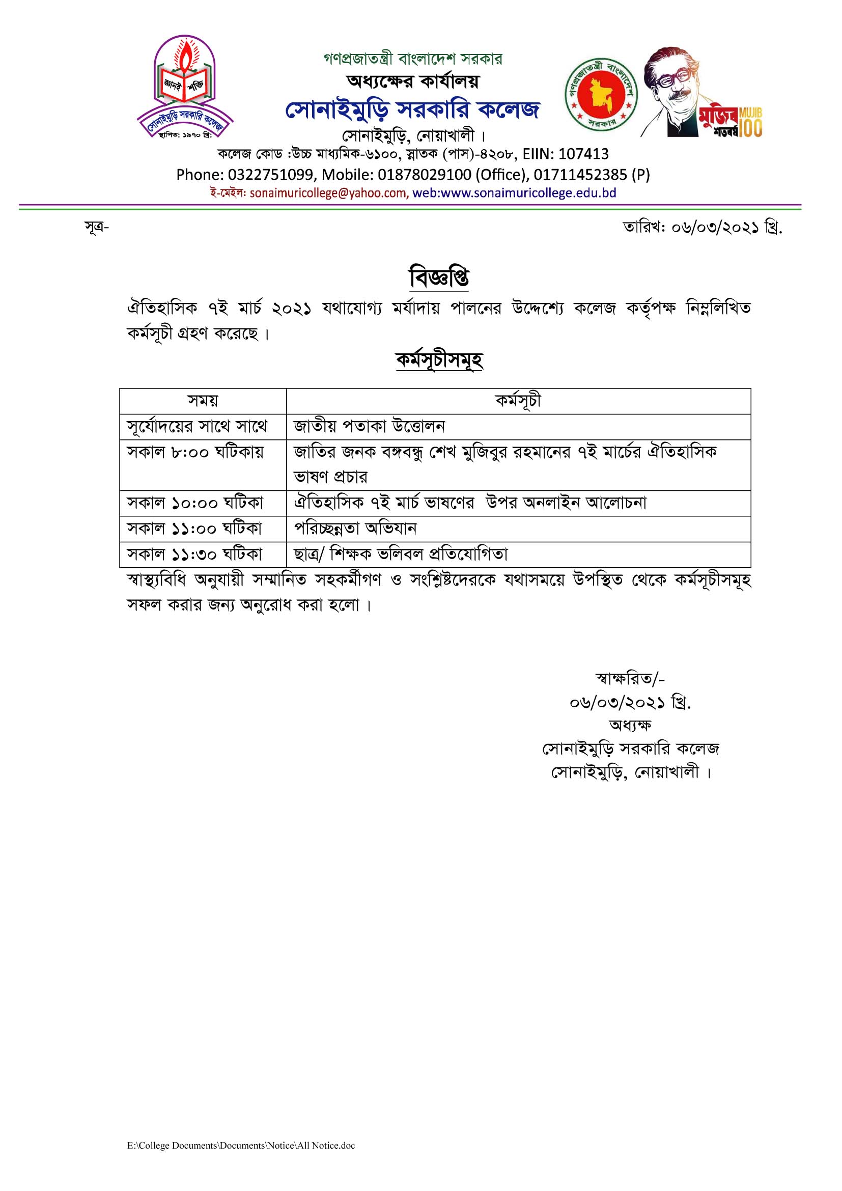????????? ?????? ???? ?????: ?????????, ??????: ?????????,????????, ????????? School Code : 6100 Email : sonaimurigovcollege@gmail.com Contact Number: 8801711452385
