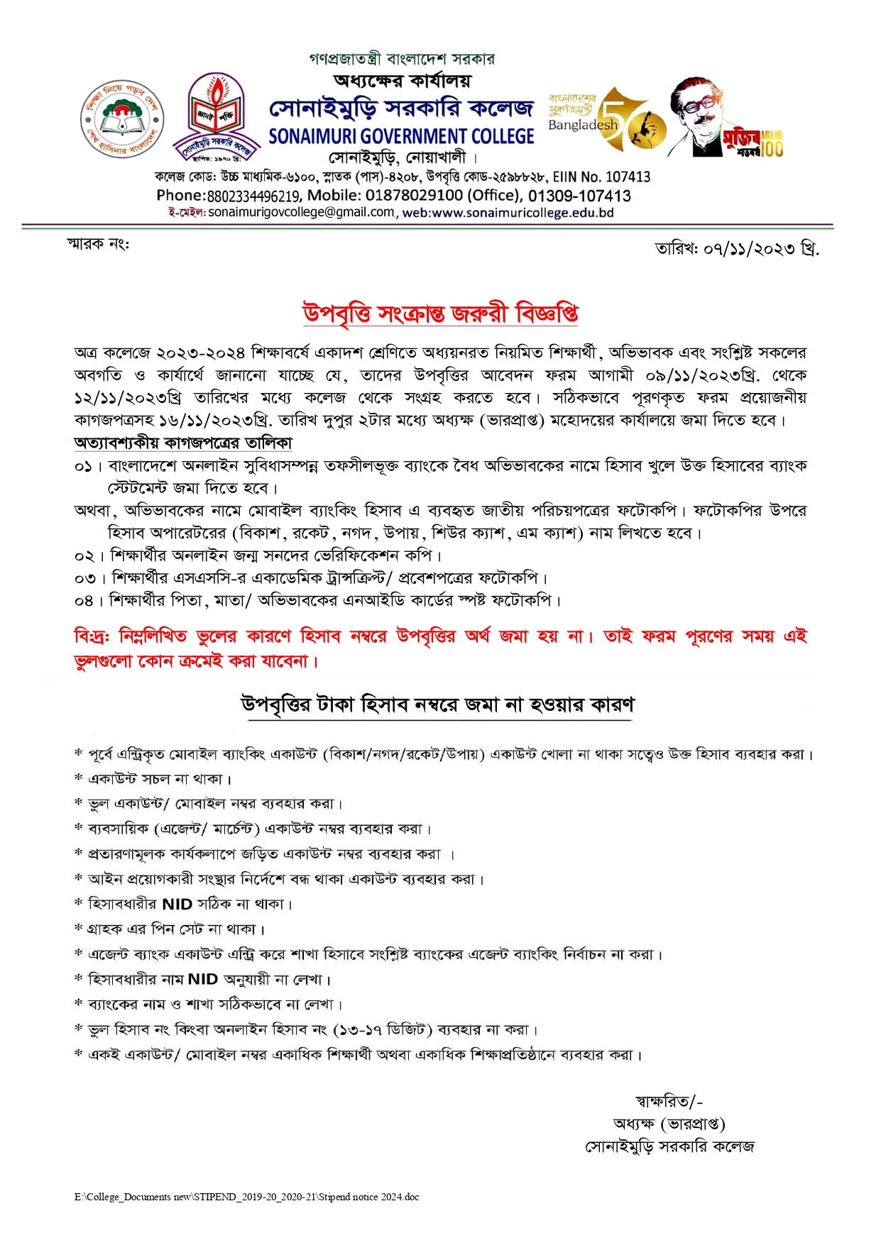????????? ?????? ???? ?????: ?????????, ??????: ?????????,????????, ????????? School Code : 6100 Email : sonaimurigovcollege@gmail.com Contact Number: 8801711452385