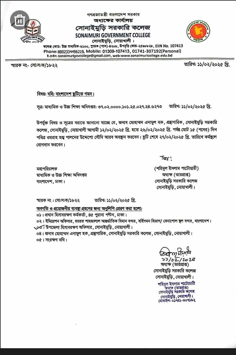জনাব মোহাম্মদ এনামুল হক, গ্রন্থাগারিক এর বহি: বাংলাদেশ ছুটিতে গমন ছাড়পত্র (Download)